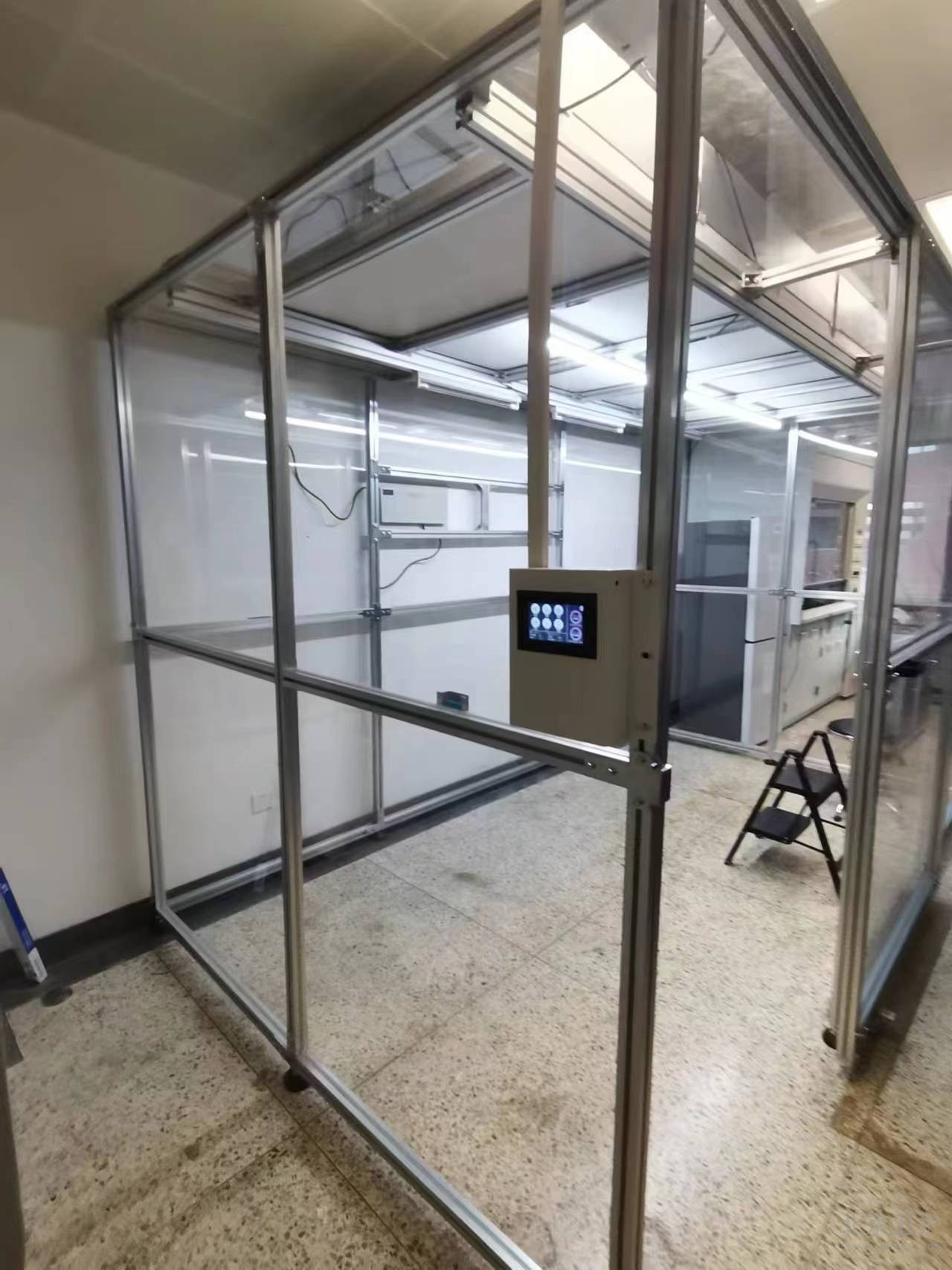 9月份我公司接到此項(xiàng)目后便抓緊時(shí)間出具相關(guān)方案、設(shè)計(jì)圖紙,經(jīng)過(guò)不斷的溝通和改動(dòng),最終確定施工方案。此單位潔凈棚設(shè)計(jì)面積20平米,主體材質(zhì)為鋁型材,隔離板使用亞格力板,頂部配有紫外線燈輔助殺菌,過(guò)濾系統(tǒng)為百級(jí)凈化模塊,并配有我公司研發(fā)的控制系統(tǒng)。從最初的方案設(shè)計(jì)、安裝施工,到最后的驗(yàn)收,總工期為10個(gè)工作日。